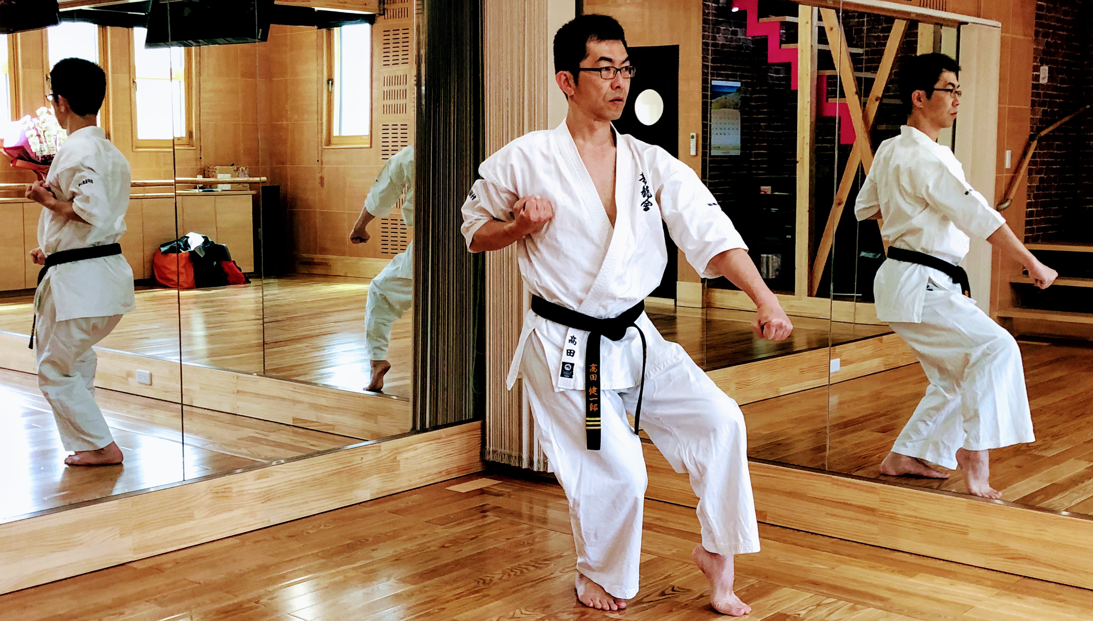 自由に動き回ることができる組手試合においては、ステップによる回避や、体重移動を使った力強さが求められるので、ほとんど使われることはありませんが、最小限の動きでキレを出す腰の使い方や、こちらが攻撃を受ける面積を最小にしつつ、相手のあらゆる攻撃にその場で対処できる利点は、実践の場面を想定すると、たとえば、背面が壁になるところで追い詰められたりしたら、とても役に立つでしょう。(もちろん、現実世界ではそんな場面に巻き込まれないようにすることがそもそも大事ですし、万一そうなっても、迎え撃つのではなく、逃げることが第一です)