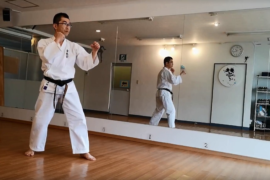 一度逆構えで、相手の動きを見極めます。(試合であれば、状況によって更に加撃します。)