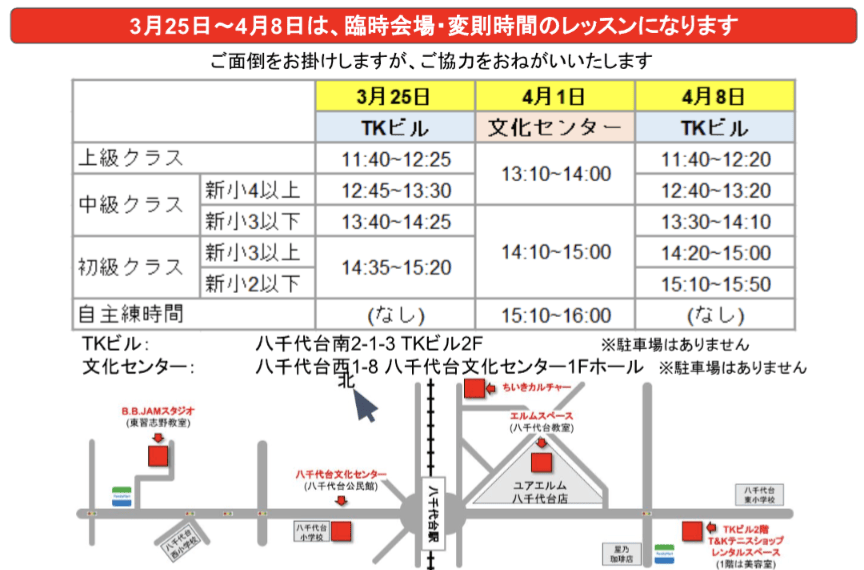 八千代台教室は、今日はTKビルでの開催でした。来週(4/1)は八千代台文化センター、4/8はTKビルで、ユアエルムに戻ってくるのは、4/15になります。時間割は、下記参照ください。